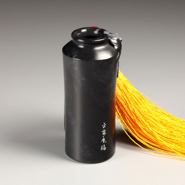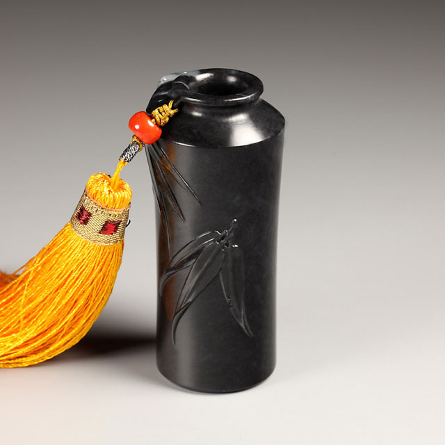 祝福把玩瓶,瓶身造型端庄古雅,俏色蝙蝠展翅,瓶身浮雕数丛竹叶,竹枝劲挺竹叶如剑,颇见竹之风骨。瓶下角镌有“平安是福”四字。