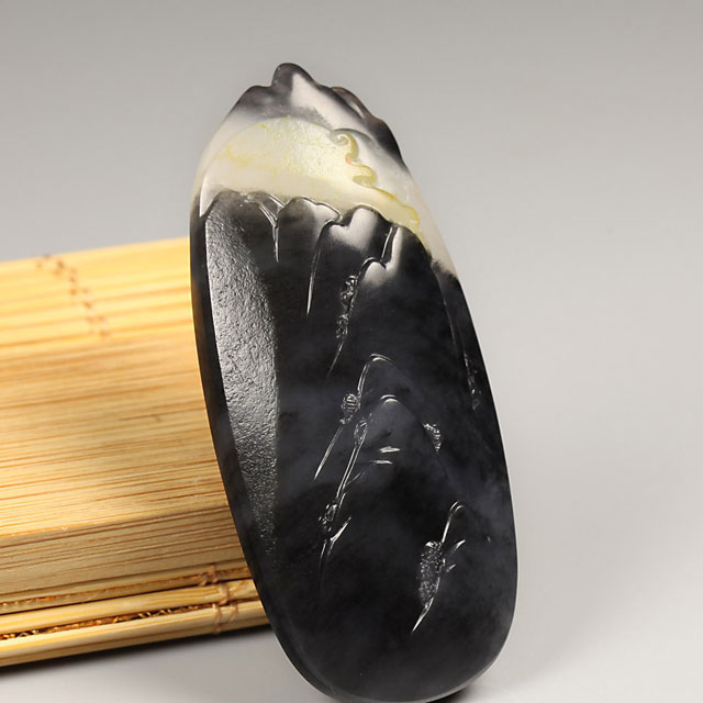 一旦说到墨玉青花,必不可少的就要说到青花山水牌。黑山白水云雾渺渺,简单勾画,已觉韵味无穷,墨玉青花的独特魅力,大抵在此。