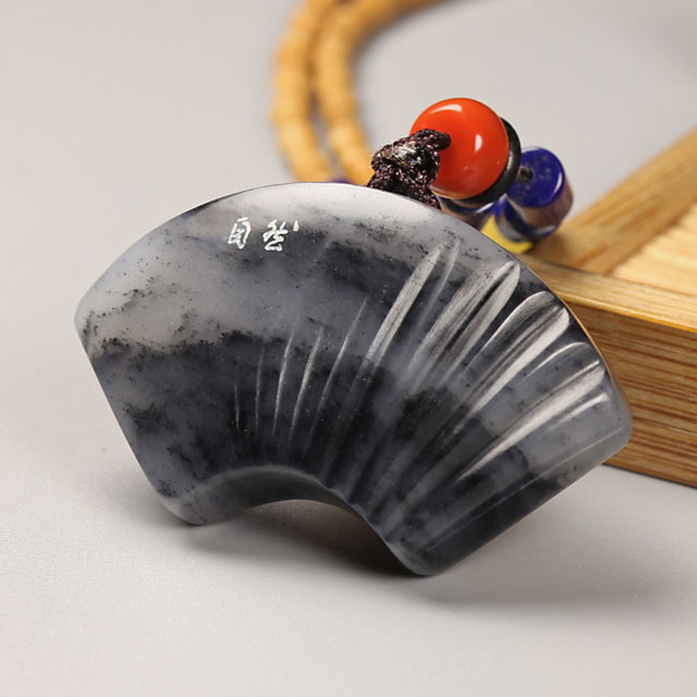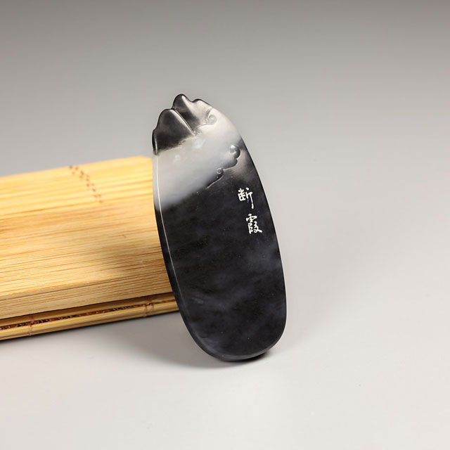 所谓自然即万物生长,自然而发。此枚扇形牌造型精巧玲珑,设计师稍加定型,略事雕琢折痕,衬以本身黑白玉色,倍显云山雾罩之美,颇见自然之趣。