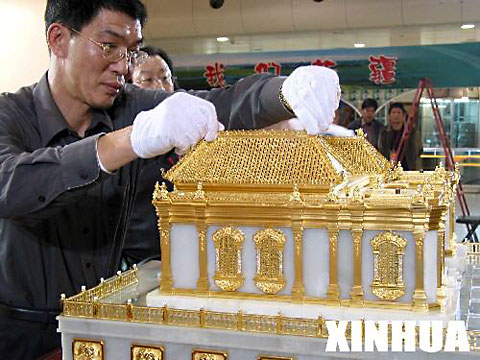 据介绍,"圆明园金玉大水法"制成于上世纪80年代,由80多位能工巧匠经5年多时间完成,它以1∶38的比例精致再现了圆明园内的重要建筑"大水法"。它的评估价值为2.33亿元人民币,堪称"国内第一标"。它实际耗用瑞士进口千足黄金60公斤,上乘珠宝翠钻4500粒,其中南非钻石约2500粒,斯里兰卡、缅甸、泰国产红蓝绿宝石1200粒,珍珠590粒,翡翠210块,"骨架"是从2.5吨重的新疆玉料中精选160公斤和田玉制成的,底座由已故国画大师关山月工作室设计制作