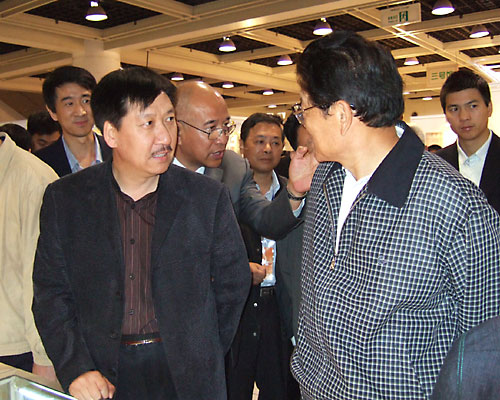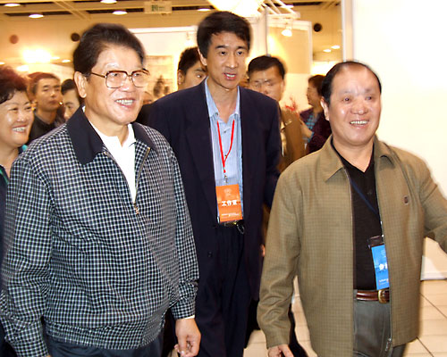 人大常委会副委员长李铁映在新疆工艺美术协会会长陪同下参观新疆工艺美术展位