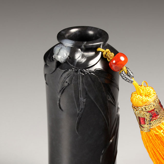 祝福把玩瓶,瓶身造型端庄古雅,俏色蝙蝠展翅,瓶身浮雕数丛竹叶,竹枝劲挺竹叶如剑,颇见竹之风骨。瓶下角镌有“平安是福”四字。